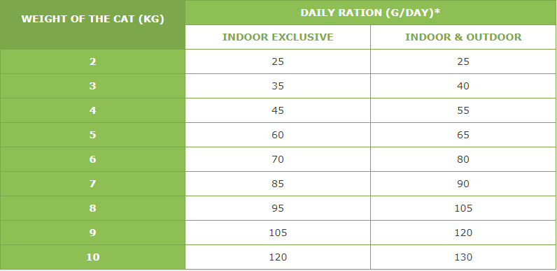 * Quantità indicative, variabili in base alla razza del gatto. Per ulteriori informazioni, rivolgetevi al vostro veterinario.